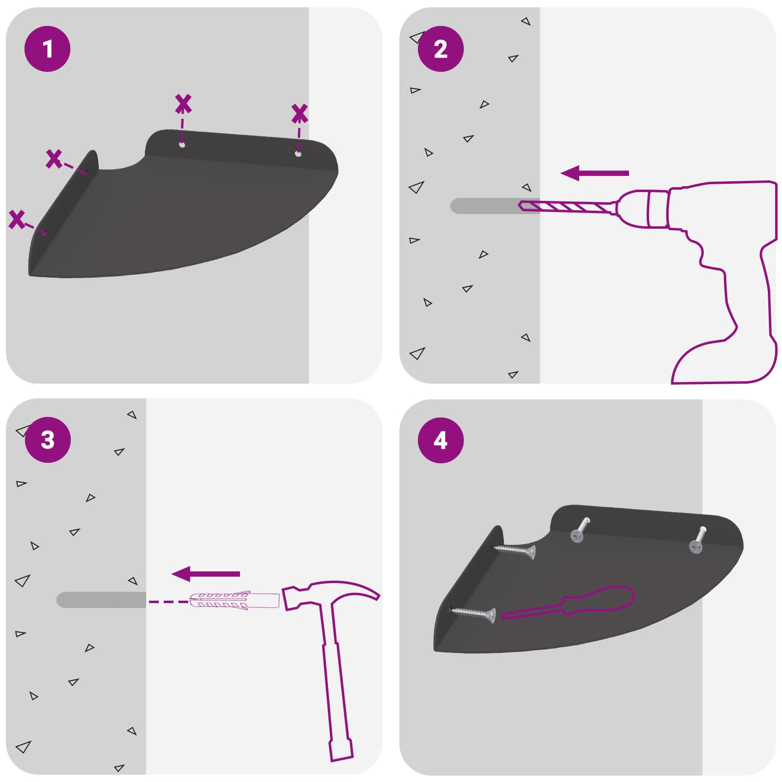 • Schroeven en pluggen voor montage in de muur zijn niet inbegrepen. Wij adviseren schroeven en pluggen te gebruiken die specifiek geschikt zijn voor uw muren.