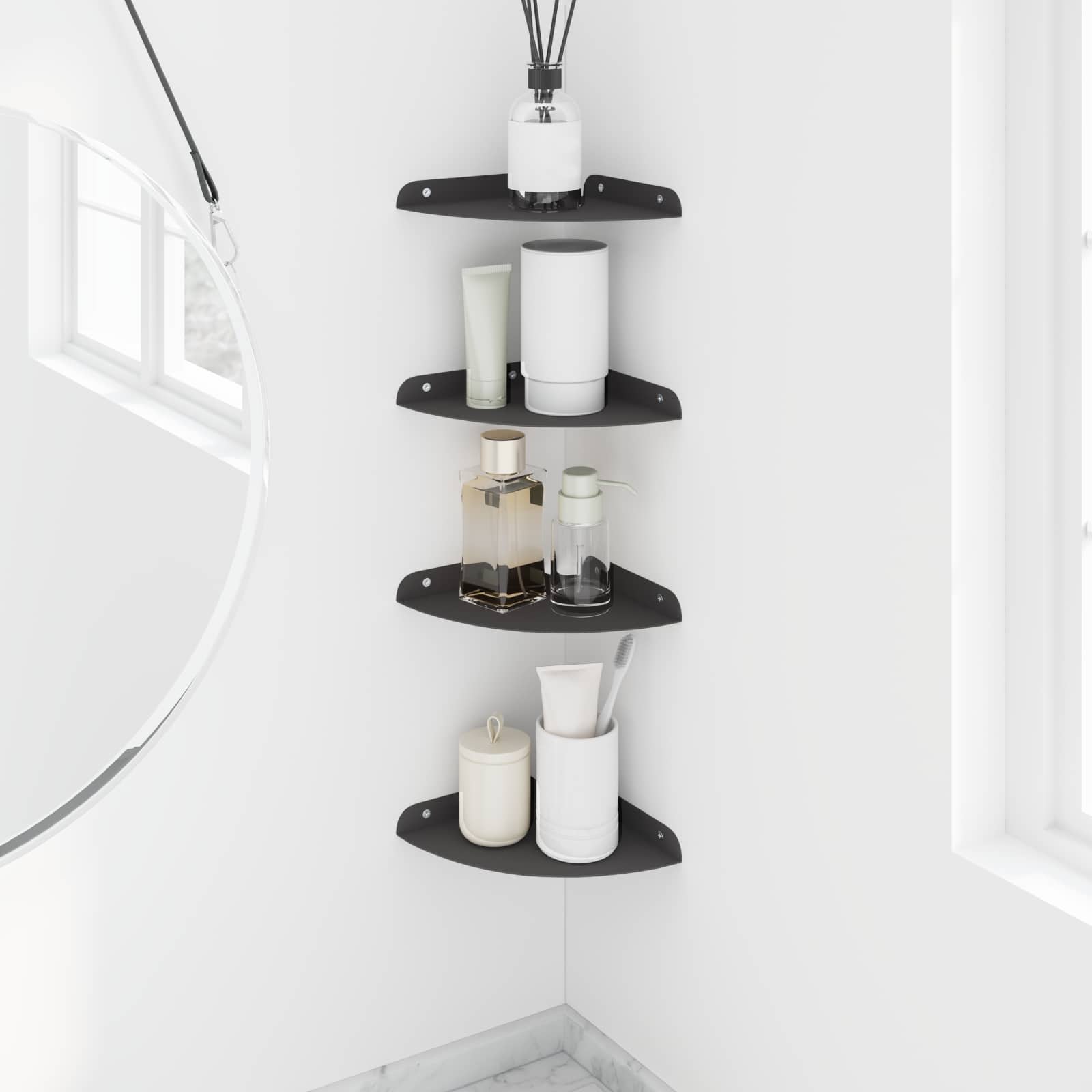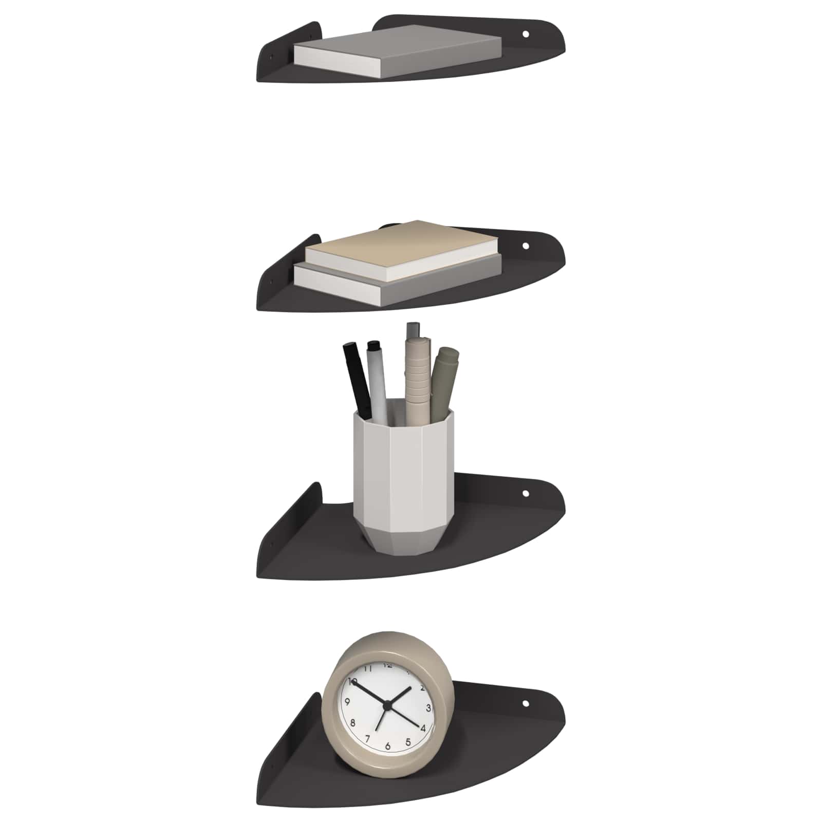 Deze stalen floatplank biedt een mooie mix van moderne stijl en handige functionaliteit. De kwart ronde vorm maakt hem ideaal voor iedereen die van minimalisme houdt maar geen inboet op het praktische. Of het nu in de woonkamer, keuken of badkamer is, deze plank maakt de ruimte mooier en zorgt voor efficiënte opbergruimte.